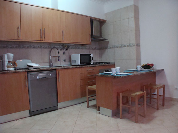 Cocina totalmente equipada con mesa para cuatro personas y una mesa de comedor para cuatro personas.
