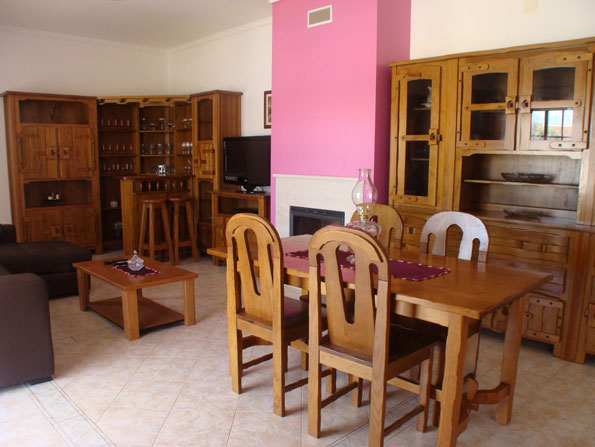 Amplio salón-comedor con mesa para 6 personas, sofá-cama, LCD, DVD, equipo de música, bar y chimenea.